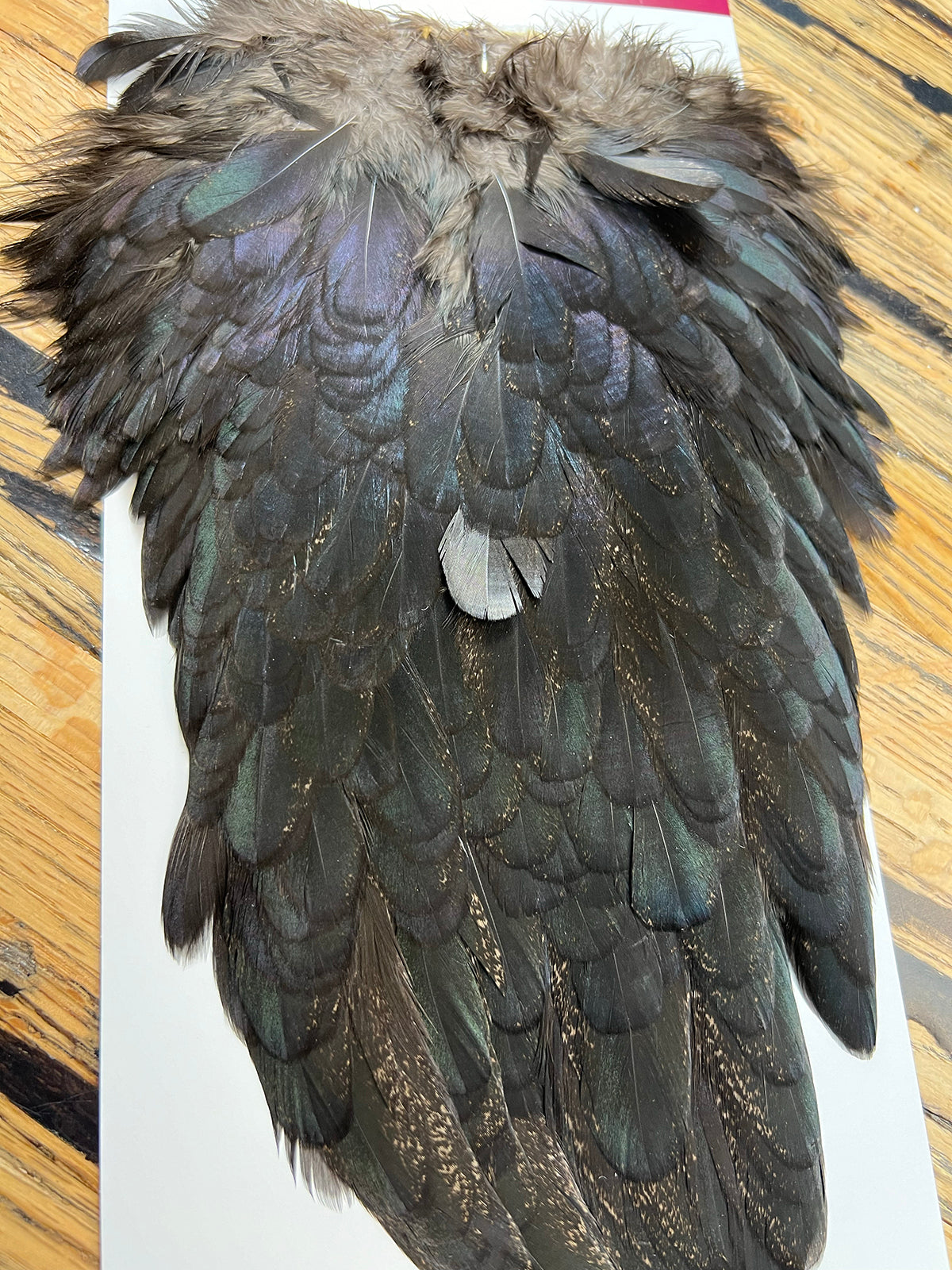Whiting Farms Coq de Leon Hen Saddles. These are two to three times the size of a regular India hen saddle. The feathers are much bigger, more beautifully mottled and come in a range of natural and dyed colors. Beautiful stuff perfect for streamer collars and nymph tails and legs.