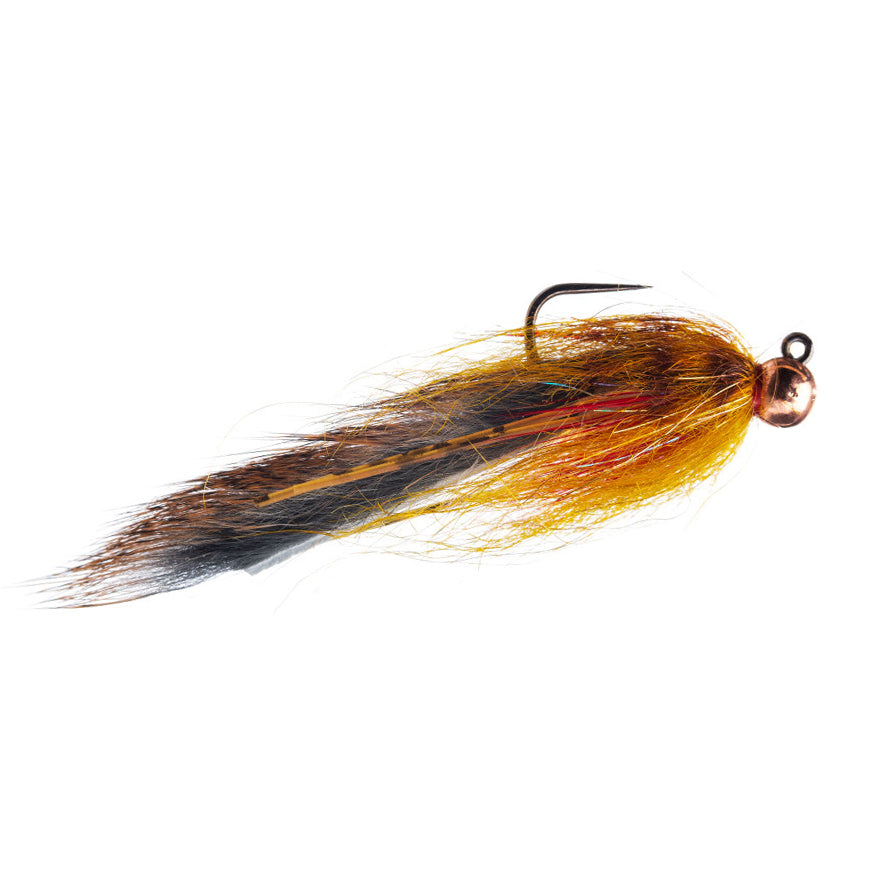 This one is pretty dang crafty, I have to say. Squirrel strip, a big fat tungsten bead, a jg hook and some long fibered dubbing make for a perfect high sticking sculpin pattern. Daddy likes... In Ginger or Olive, size 6 only