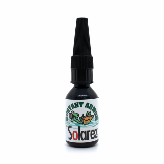 Solarez Buoyant Armor creates a buoyant tack-free coating on foam and balsa wood poppers. It can be applied to crab underbodies and terrestrials. It has a bright white finish. Highly buoyant, plant-based UV resin excellent for fiber wetting.